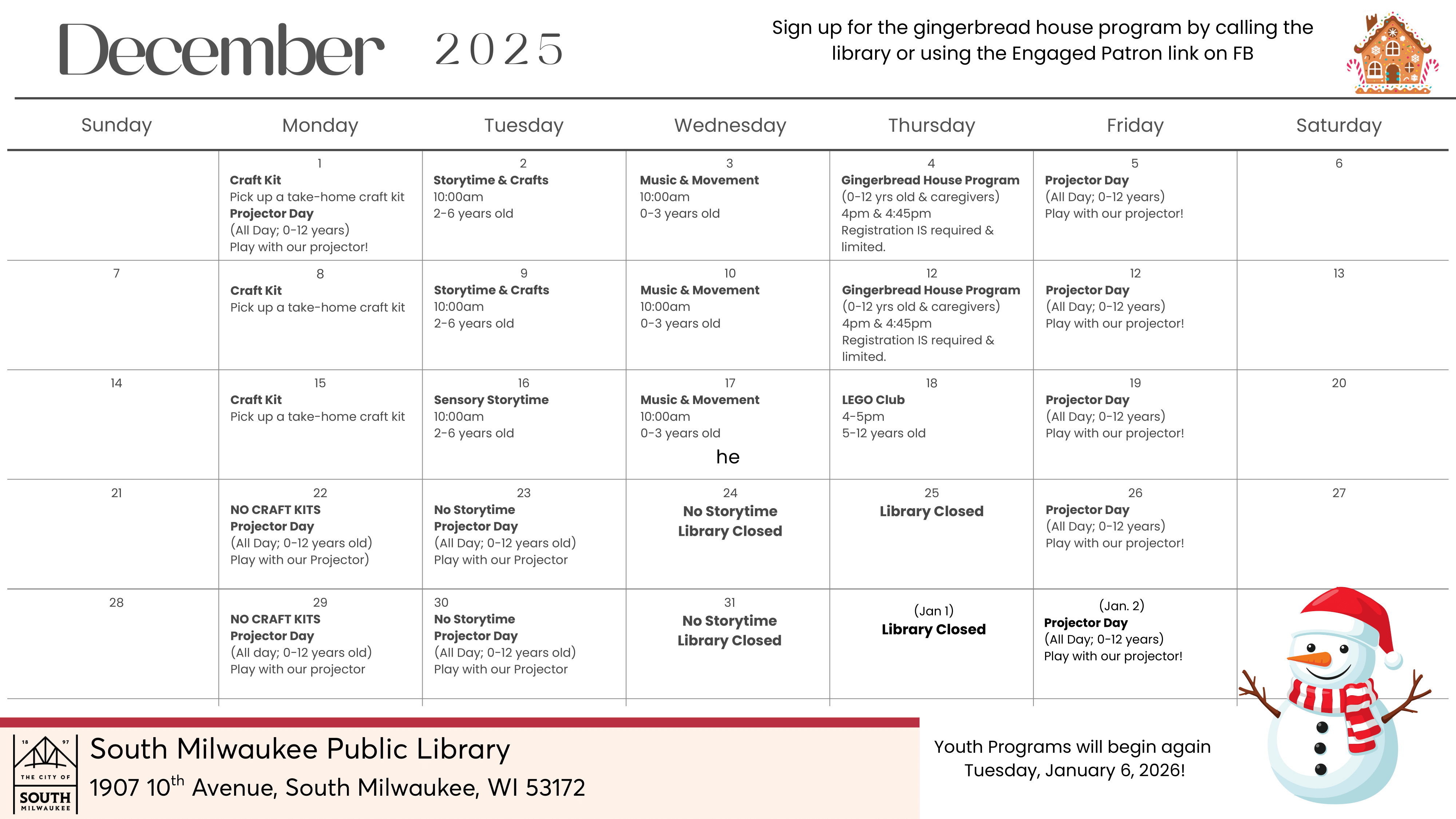 South Milwaukee Public Library, 1907 10th Ave., South Milwaukee, WI 53172 (414) 768-8195